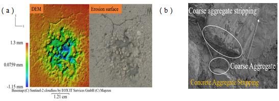 风沙流速为30 m/s,风沙攻角为90°,磨蚀时间为8 min时混凝土磨蚀试件的微观形貌分析:(a)运动结构重建(SfM)获得三维表面形态;(b)扫描电镜(SEM)二维表面分析