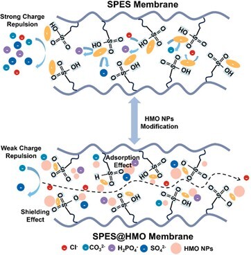 针对上述挑战,中国科学院青海盐湖研究所离子吸附科学与技术课题组提出了一种氯离子膜“电荷屏蔽效应”设计策略,开发了一种由磺化聚醚砜(SPES)与水合锰氧化物(HMO)颗粒复合的新型混合基质膜-氯离子吸附膜(SPES@HMO)。该膜利用HMO纳米颗粒调控膜界面电荷环境,从而特异性增强氯离子的传输,同时结合竞争吸附机制抑制多价阴离子的通过,为高盐废水中氯离子的高精度筛分提供了全新解决方案。