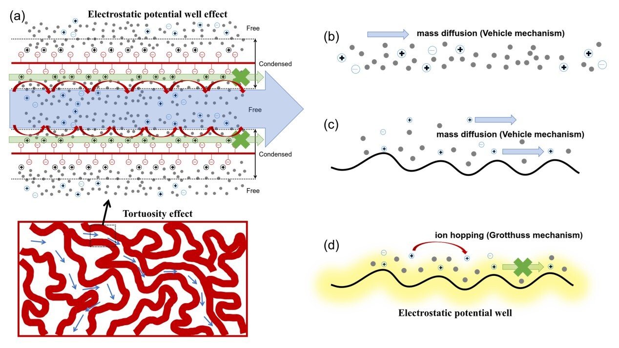 图1. 迂曲的高电荷密度纳米离子传输通道内的“反离子异常传输增强”机制示意图及其与其它离子传输机制(纯水溶液和之前认为的膜内离子传输机制)的差异