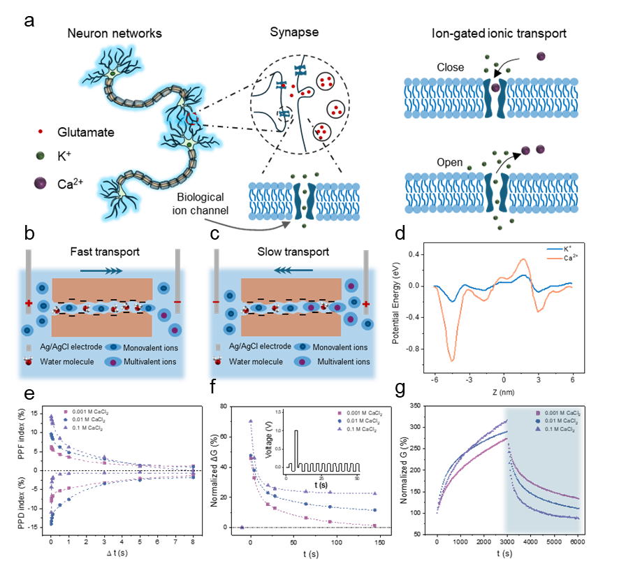 图:基于亚纳米通道离子径迹膜制备的纳流体忆阻器仿生原理及其突触功能演示