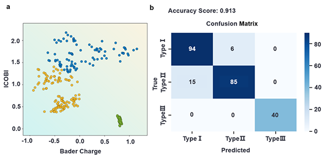 团队进一步引入机器学习分类方法,以ICOBI(晶体轨道键指数)和Bader电荷转移量为特征,训练支持向量分类器。五折交叉验证表明分类器达到较高准确率,在不依赖电负性概念的前提下,从电子结构层面揭示了共价键合与离子键合特性之间的区别是不同吸附物应变响应差异的物理本质。