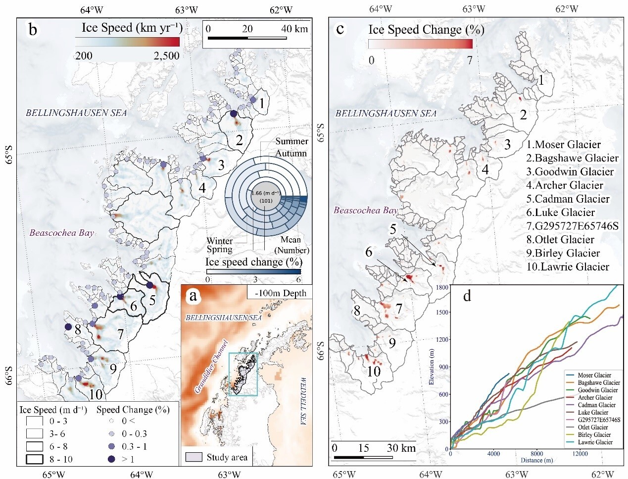中国科学院西北生态环境资源研究院冰冻圈科学与冻土工程全国重点实验室康世昌研究员团队,基于2015年5月至2025年4月的Sentinel-1卫星观测数据,系统分析了南极半岛Beascochea海湾101条冰川流速变化特征,重点揭示了海湾上层海水变暖对冰川流速加快的关键作用。