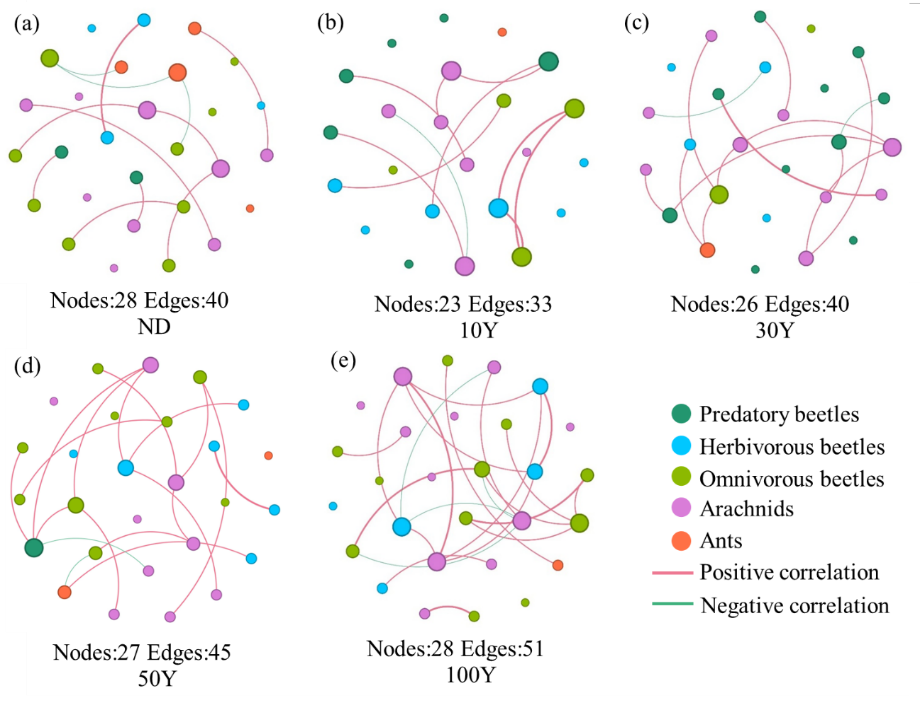 天然荒漠、10年、30年、50年和100年农田不同营养级地表节肢动物的共线性网络