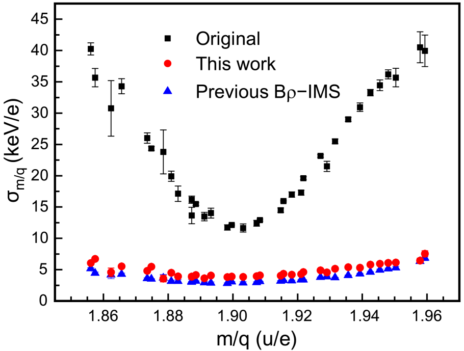 图:本方法(红点)与之前Bρ-IMS(蓝点)给出的质荷比(m/q)标准差的对比。黑点为传统等时性质谱术(未进行磁场修正)的结果