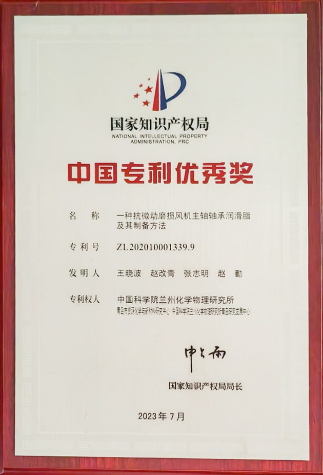 近日,第二十四届中国专利奖颁奖大会在大连举办,对在实施创新和推动经济社会发展等方面作出显著贡献的专利权人、发明人(设计人)以及相关组织者进行表彰。中国科学院兰州化学物理研究所作为第一专利权人完成的“一种抗微动磨损风机主轴轴承润滑脂及其制备方法”获中国专利优秀奖。