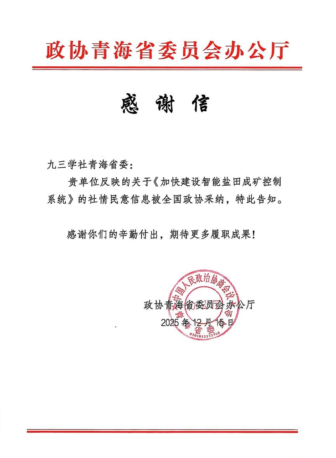 九三学社青海盐湖所委员会建言献策获全国政协采纳