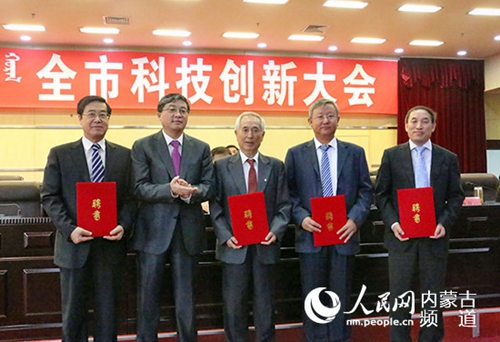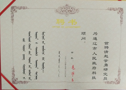 会上,赵学勇还被聘为通辽市人民政府科技顾问。通辽市委书记罗永纲为其颁发聘书。