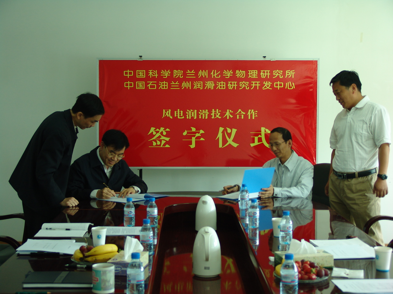 5月11日上午,中国科学院兰州化学物理研究所与中国石油兰州润滑油研究开发中心举行了进一步合作推动大型风力发电机组高性能润滑剂研究开发与产业化应用的签字仪式。兰州化物所所长刘维民研究员、兰州润滑油研发中心主任张少明高级工程师分别在合作协议上签字,标志着双方将进一步在风电设备用高性能润滑油脂研制与开发应用方面开展实质性的合作。