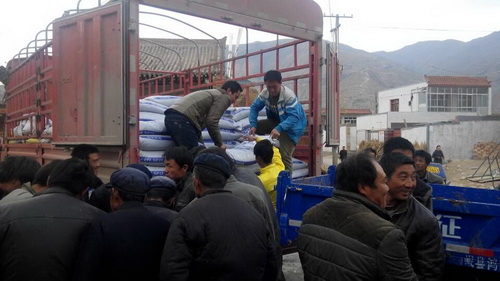 在维新乡副乡长、坪上村驻村干部和村委会干部的陪同下,寒旱所向坪上村267户人家各送去一袋化肥,并送去了寒旱所全体职工对乡亲们的亲切问候。