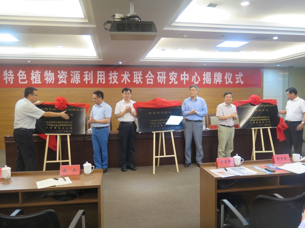 为发挥中国科学院兰州化学物理研究所在科学研究和人才资源等方面的优势,加快天然植物资源的高值化利用步伐,依靠科技推动功能植物提取物产业的科技创新,促进重大科技成果转化,7月8日上午,由中国科学院兰州化学物理研究所、江苏绿茵生物科技有限公司和中国科学院南京分院联合建立的“徐州特色植物资源利用技术联合研究中心”揭牌仪式在徐州举行。中科院兰州分院副院长杨青春、南京分院副院长杨涛、兰州化物所所长助理赵培庆、西北特色植物资源化学重点实验室主任/徐州特色植物资源利用技术联合研究中心主任邸多隆分别在揭牌仪式上发表讲话和致辞。中国科学院院士、兰州化物所刘维民研究员出席会议并揭牌。中科院南京分院院地合作处处长尹睿主持了揭牌仪式。