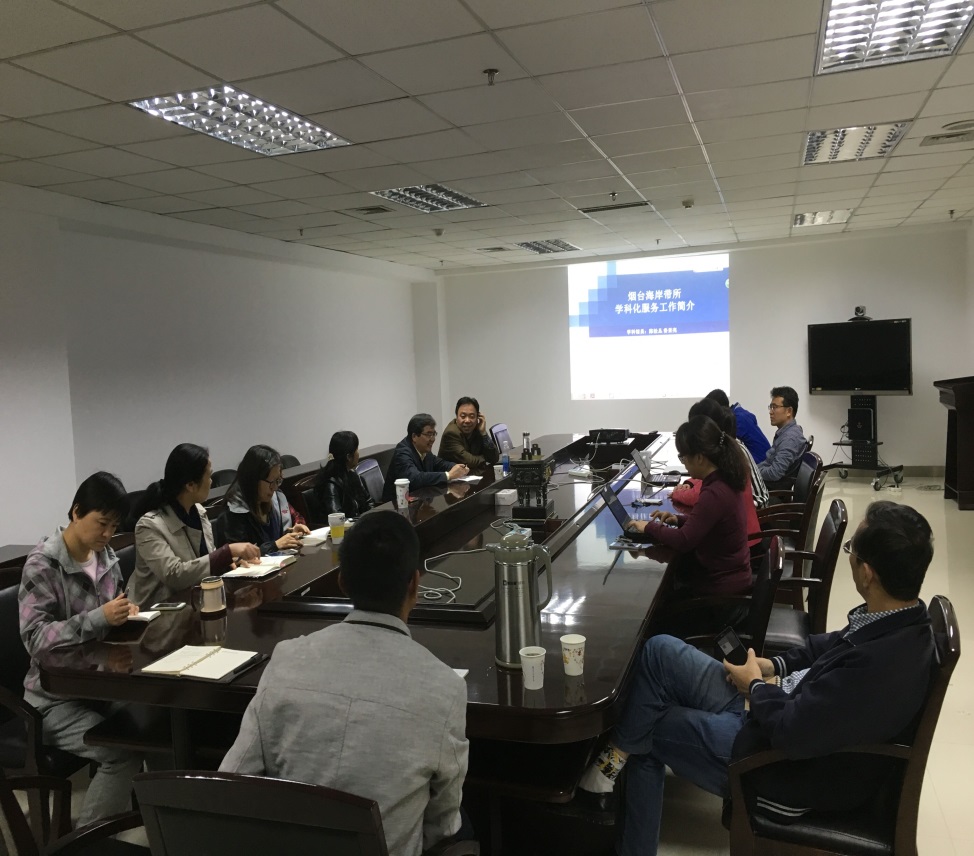 学科咨询部主任马建霞介绍了学科咨询服务部的服务布局、团队建设、面向研究所率先行动、分类定位改革和院重点实验室评估所开展的学科发展态势分析和科研创新影响力评价工作等重点工作。责任学科馆员陈松丛汇报了近年来面向烟台海岸带研究所开展的学科信息服务。