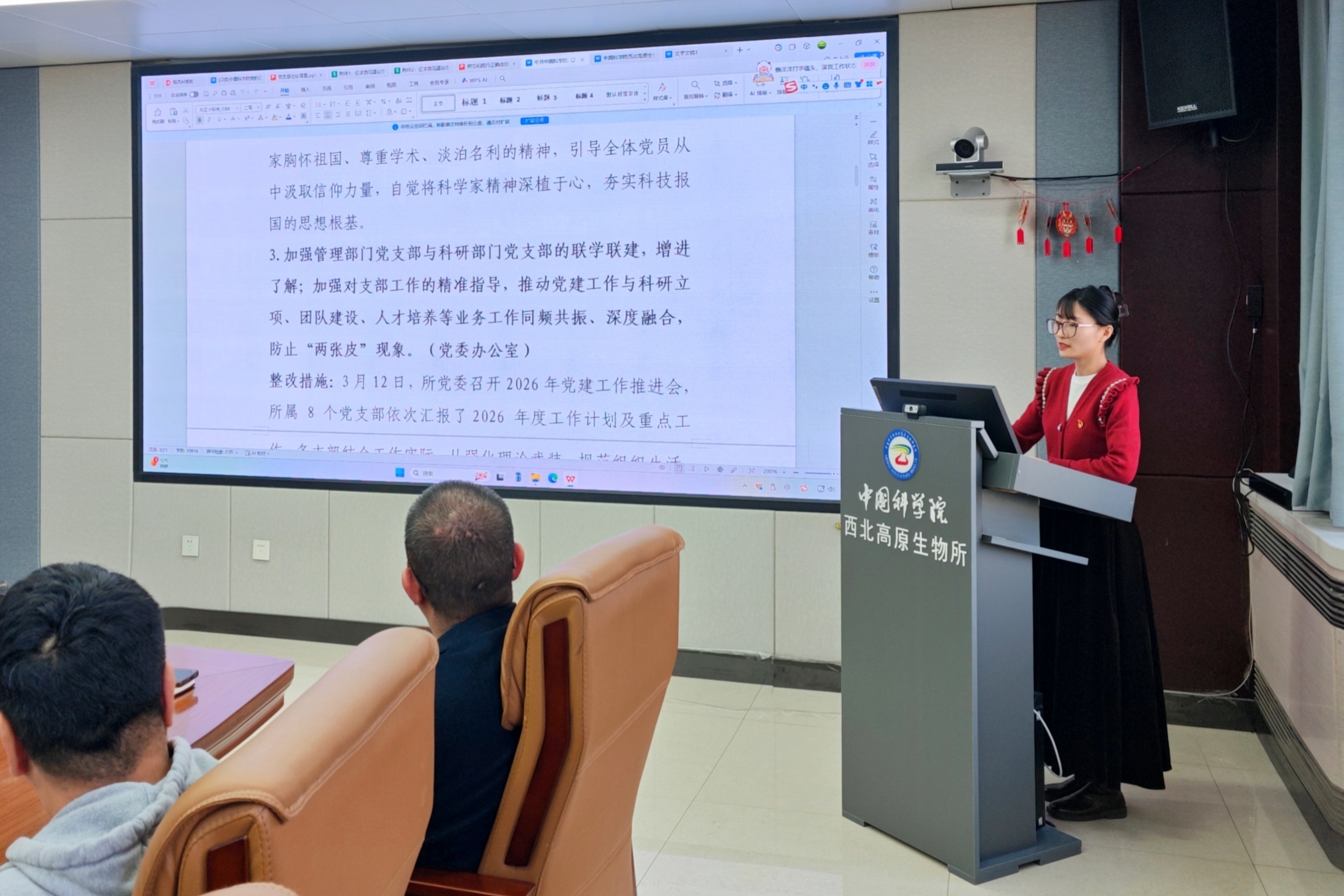 宣传委员董亚慧通报了《中共中国科学院西北高原生物研究所委员会2025年度党员领导干部民主生活会征求意见反馈》,重点围绕理论武装提升、管理机制创新、人才队伍建设、基础设施改善等方面问题进行了反馈。