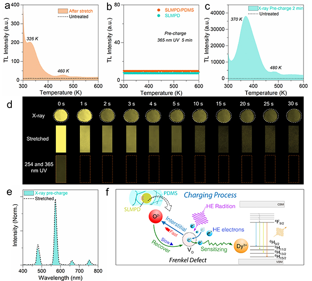 图1. SLMPD/PDMS在紫外辐照、X射线辐照和拉伸刺激前后的光谱对比,以及界面高能辐射缺陷物理机制。