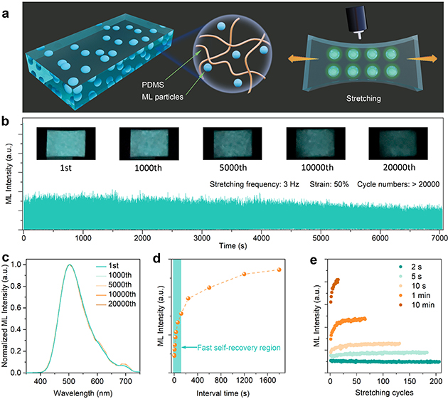 在复合型、自激活摩擦/力致发光研究方面,团队进一步克服了其在自恢复和循环稳定性方面的不足,发展出了一种基于界面摩擦电场诱导电子轰击发光模型的稀土掺杂磷酸盐基摩擦/力致发光复合材料(Ca6BaP4O17:Ce3+/PDMS)。无需预充能,该材料在机械力学的刺激下可直接展现出明亮的蓝色发光,并可循环显示1000次左右(Advanced Functional Materials,2024,34,2401535)。通过对界面摩擦电势及辐射跃迁效率调控,团队进一步构筑出一种在高频拉伸刺激下具有高重复性和高稳定性的力致发光复合弹性体(CaBa4(PO4)3Cl:Eu/PDMS),该材料可展现出20000次以上的重复、稳定摩擦/力致发光(图2),为该领域长期存在的循环稳定性不足问题提供了有效解决方案(Advanced Materials,2025,37,2505071)。