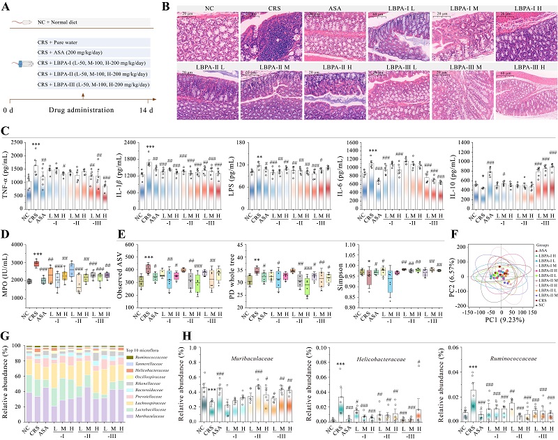 在慢性束缚压力诱导的小鼠肠道炎症模型中,活性最优的果胶组分(LBPA-III,100 mg/kg.bw)可显著减轻结肠组织损伤,恢复细胞因子平衡(如TNF-α水平降低、白介素IL-10水平升高),并抑制中性粒细胞浸润。机制层面,LBPA-III通过重塑肠道菌群结构(如降低Helicobacteraceae丰度、升高Muribaculaceae丰度)、下调促炎脂质代谢物(如1,2-dierucoyl-PE)水平,以及调控内源性大麻素系统(如CB2水平升高、FAAH水平降低)发挥抗炎作用。上述研究揭示,枸杞果胶AG-II与RG-I–AG-II这种独特的结构范式,通过“超分子伪降解”机制协同调控肠道菌群,并激活“肠道菌群-代谢物-内源性大麻素系统”轴,从而高效抑制肠道炎症。