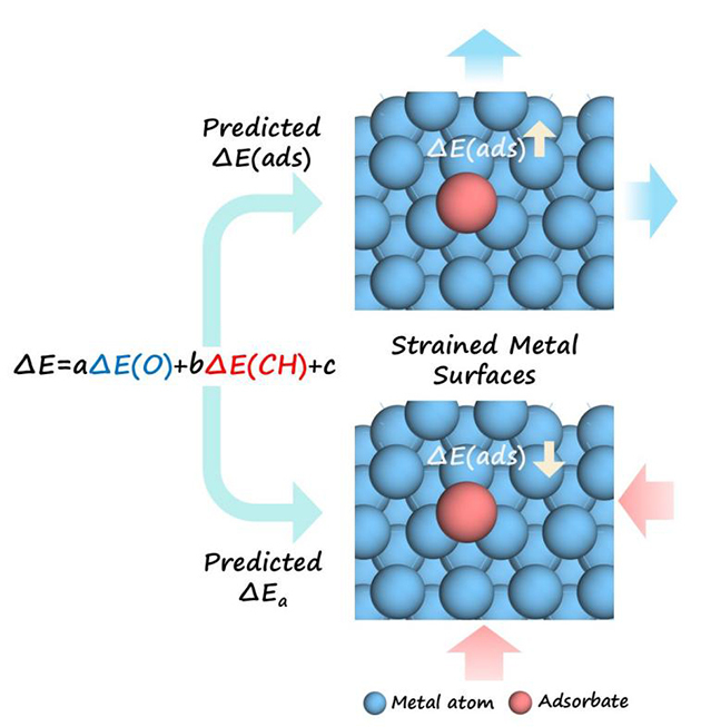 在多相催化反应中,活性金属表面的电子结构对反应物分子的吸附与活化转化起着关键作用。近年来的研究表明,通过对金属晶格施加拉伸或压缩应变,可有效调控其表面电子结构,显著改变反应物及关键中间体的吸附行为,进而实现对催化活性与选择性的精准调控。目前,应变工程已成为设计高性能催化剂的重要策略。然而,不同金属体系和不同吸附物对应变呈现出复杂且差异化的响应规律,至今仍缺乏可定量描述应变诱导能量变化的普适性标度关系,制约了高效催化剂的理性设计与精准构筑。
