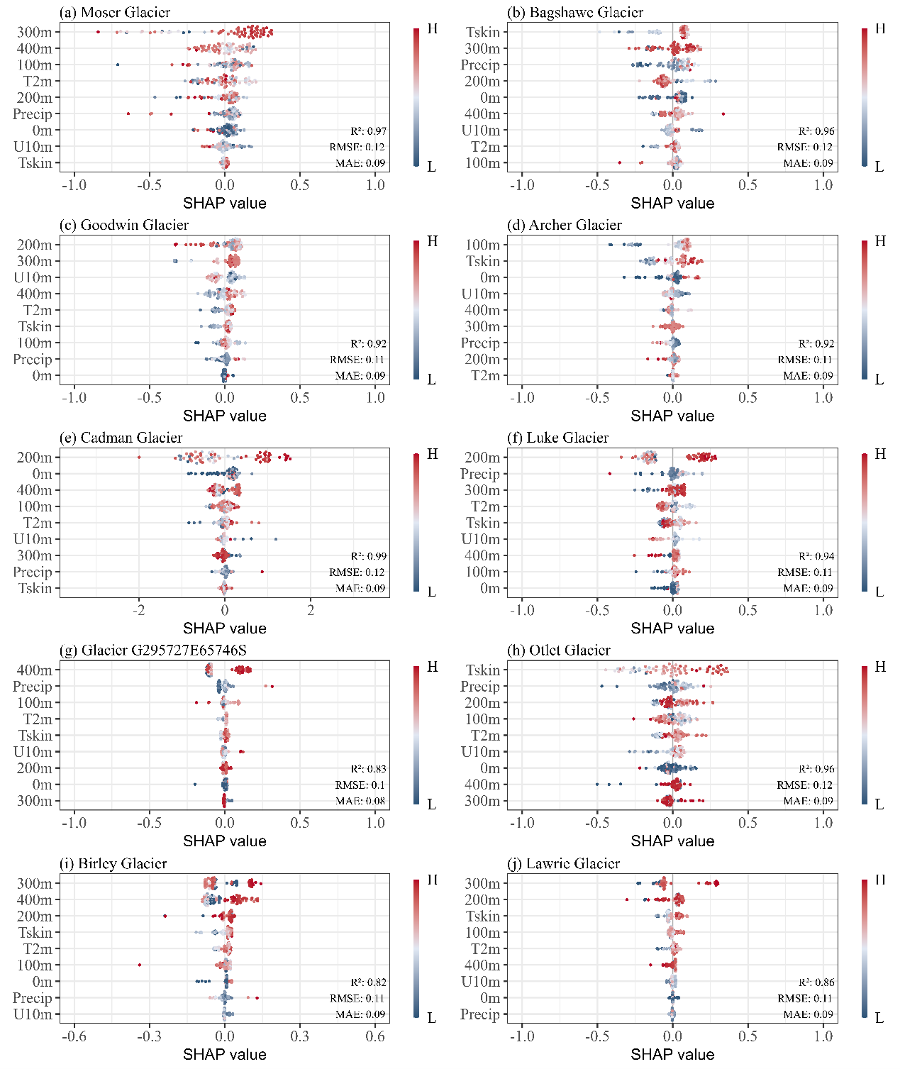 通过XGBoost 与 SHAP 模型分析不同驱动因子对冰川流速的影响。0-400 m 代表不同深度的海洋温度;Precip 表示冰川表面降水量;T2m 表示 2 米气温;U10m 表示 10 米风速;Tskin 表示冰川表面温度。