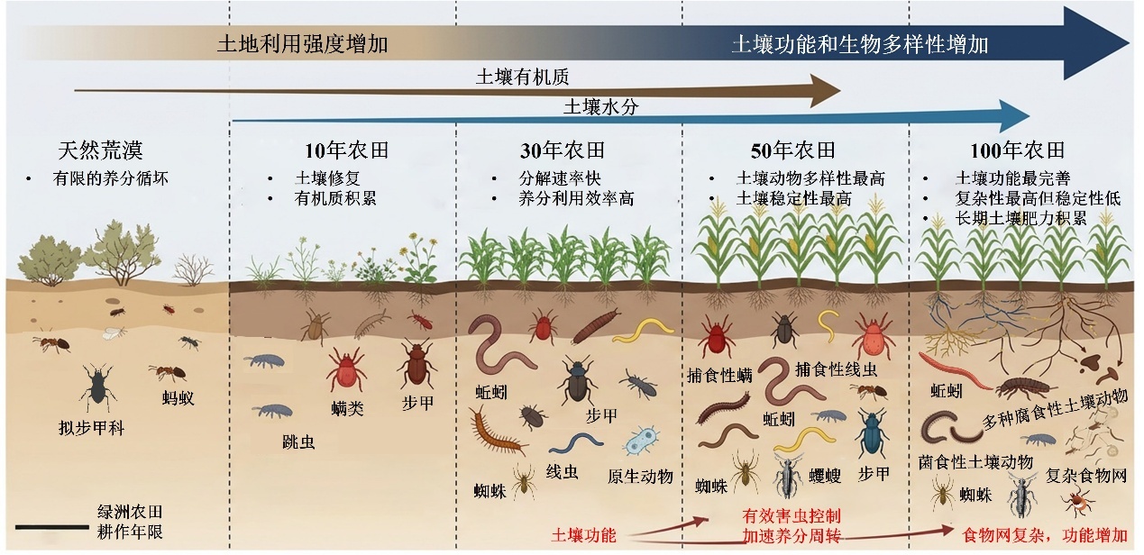 研究发现,与荒漠相比,干旱区灌溉农田的土壤动物多样性大幅提升,土壤动物功能也会随着年限的增加而增多,但长期耕作及撂荒均会对土壤动物多样性及其功能产生负面影响,进而影响土壤健康与稳定。