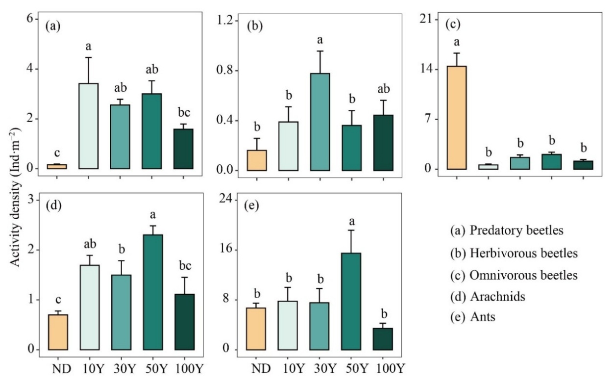 天然荒漠、10年、30年、50年和100年农田捕食性甲虫、植食性甲虫、杂食性甲虫、蛛形纲和蚂蚁的活动密度