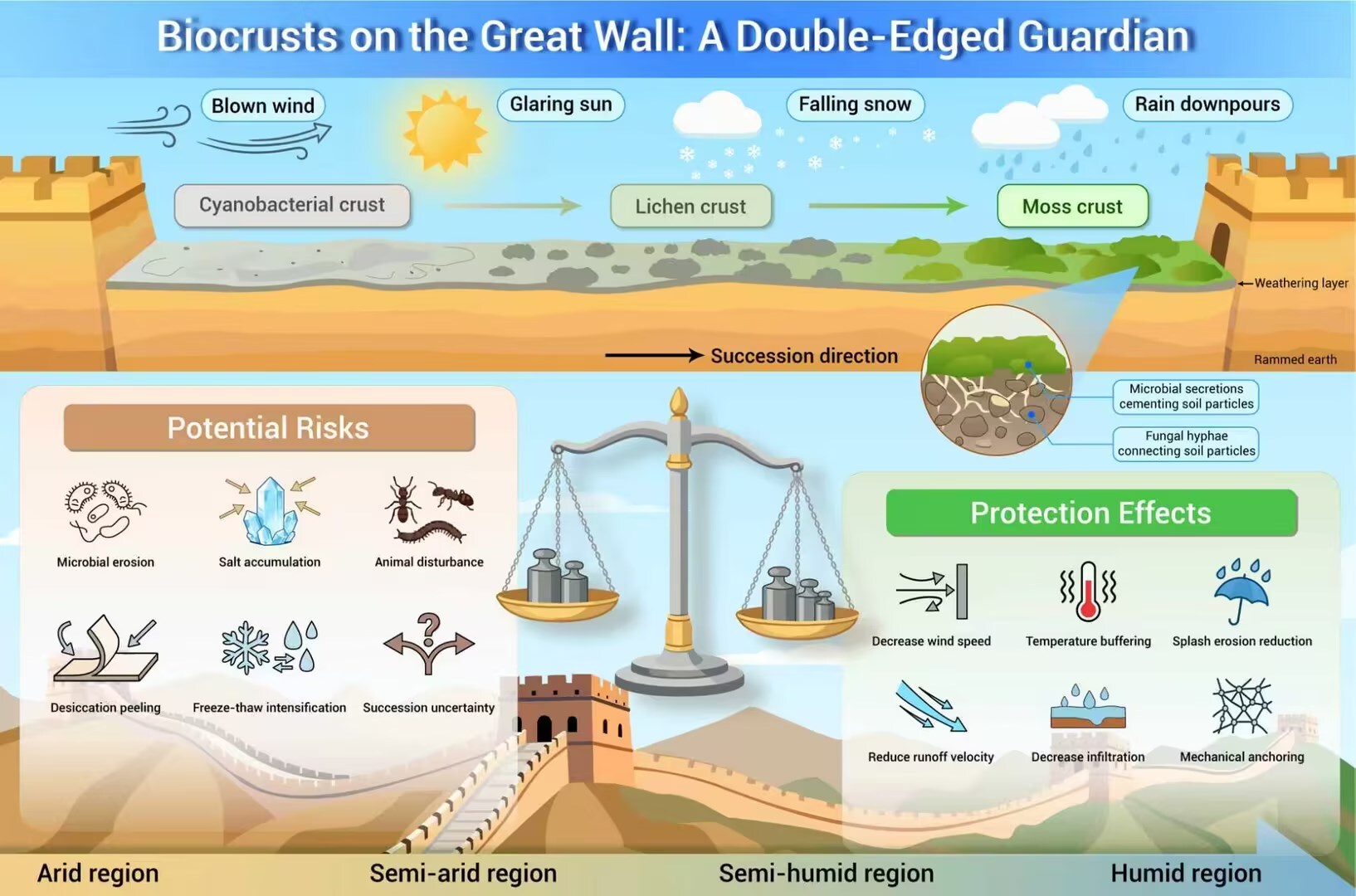 研究指出,生物结皮可为土长城遗址提供生态兼容的保护屏障,从而为夯土长城提供保护,但其实际保护效果取决于保护作用与损害风险之间的消长平衡,这一平衡受到气候环境、墙体材质与生物结皮演替阶段的共同制约。