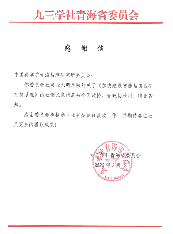 近日,从政协青海省委员会办公厅获悉,九三学社中国科学院青海盐湖研究所委员会社员张永明撰写的社情民意信息《加快建设智能盐田成矿控制系统》,已被全国政协采纳。